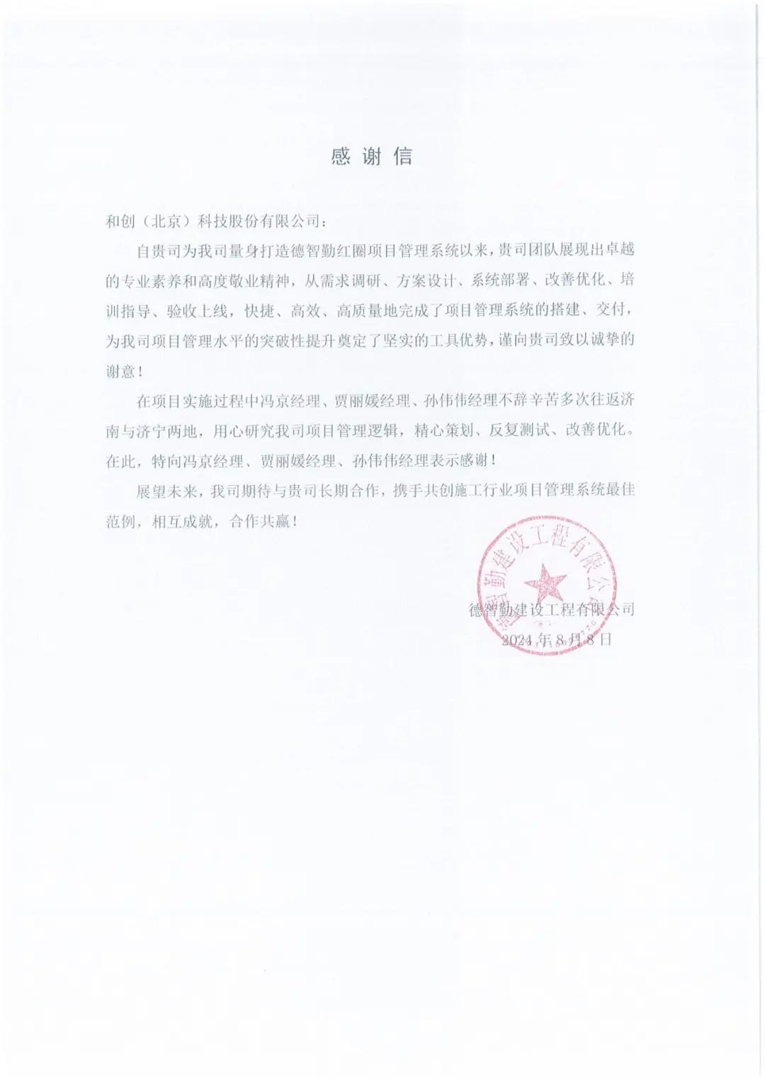合作企業(yè)?|?德智勤建設(shè)工程有限公司向紅圈發(fā)來感謝信!
